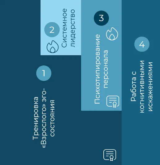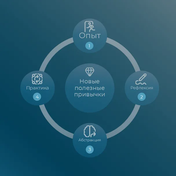 - Фокус на выработке новых полезных привычек у сотрудников в управлении и поведении. Использование "Цикла Колба", как оптимального подхода для обучения взрослых людей. Учет "Концепции Германа Эббингауза" для максимальной эффективности запоминания нового материала.