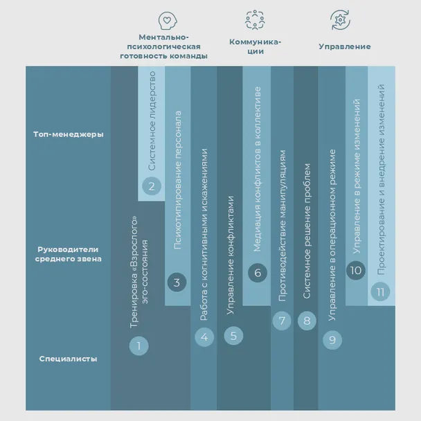 - ментально-психологические способности команды. Адекватность психологического состояния сотрудников (= эго-состояние здорового взрослого) – базовое условие развития других важных компетенций. У «взрослого человека всё просто» и большинство проблем трансформируется в решаемые рабочие задачи.
